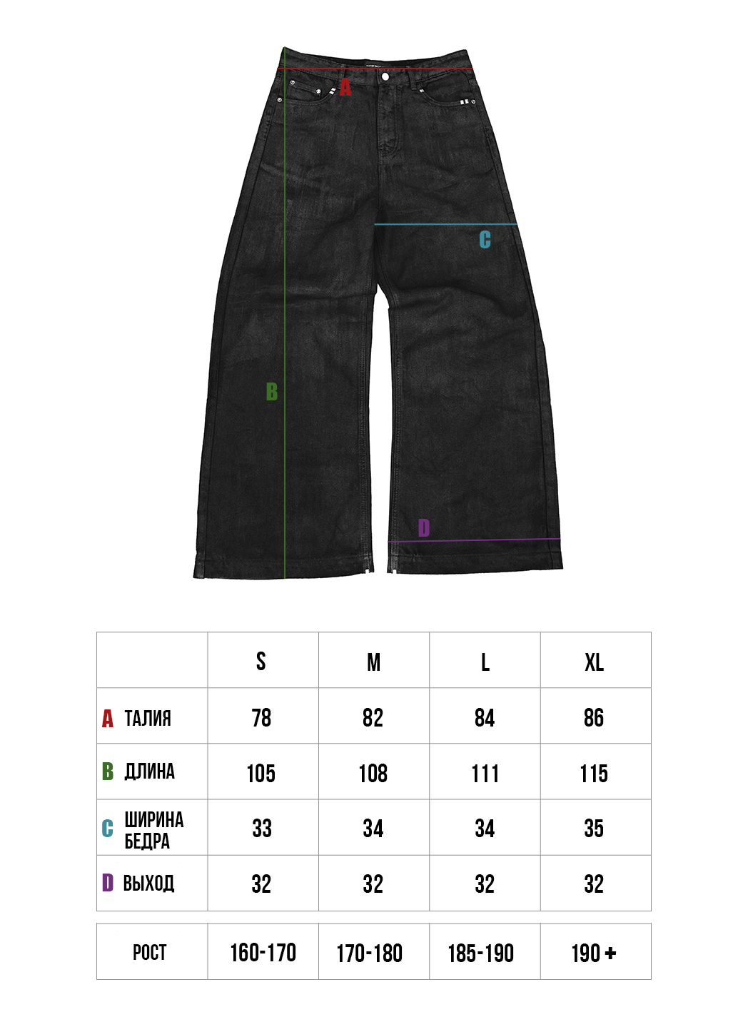 Широкие джинсы с легким клешем, начинающимся от бедра и расширяющимся к низу, также дополнены блеском, который достигается благодаря окрашиванию ткани. Каждый экземпляр окрашен вручную, что придает ему неповторимый оттенок и делает пару уникальной. Со временем джинсы будут постепенно затираться, приобретая винтажный вид.